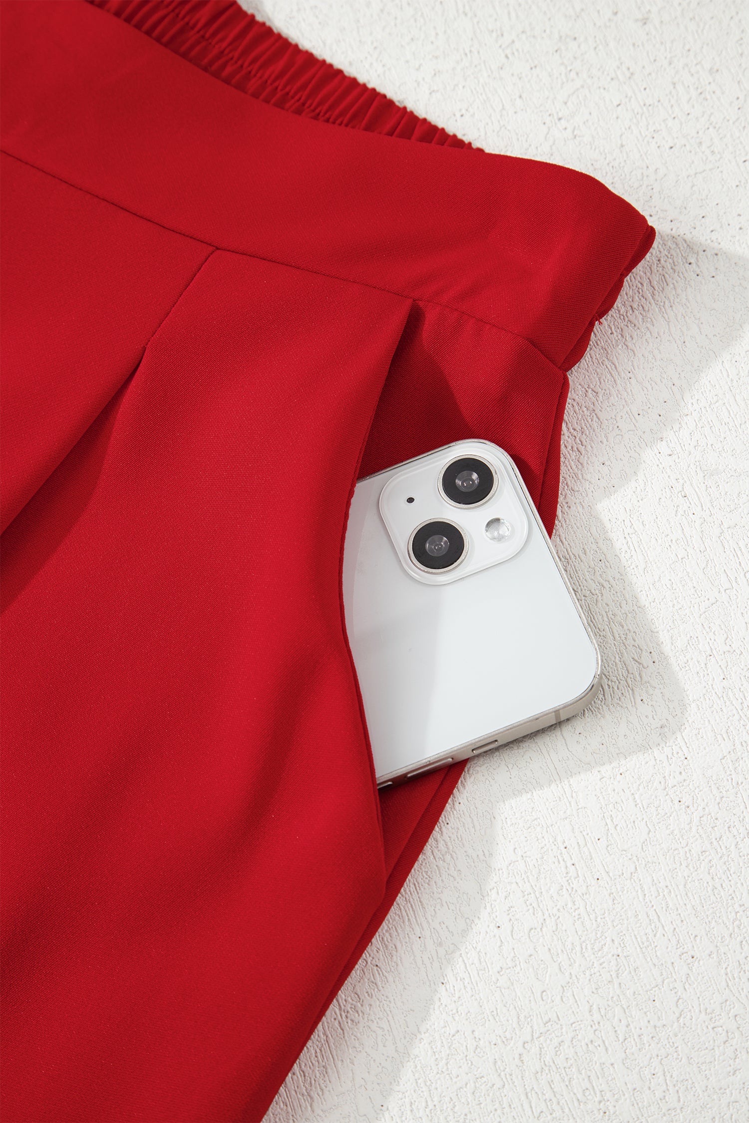 Fiery Red Pleated Detail Pull On High Elastic Waist Loose Straight Pants