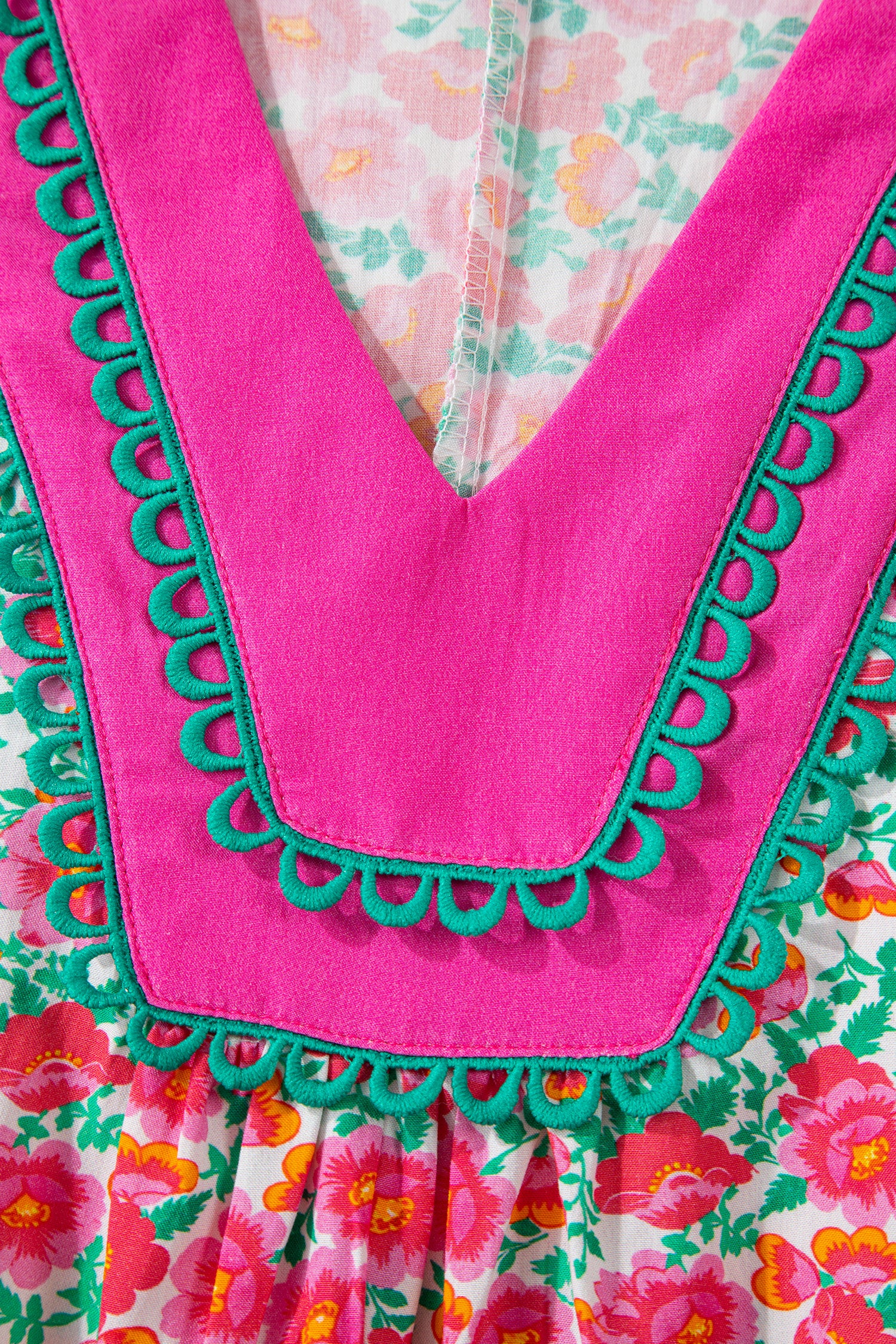 Pink Floral Print V Neck Patchwork Short Bubble Sleeve Mini Dress